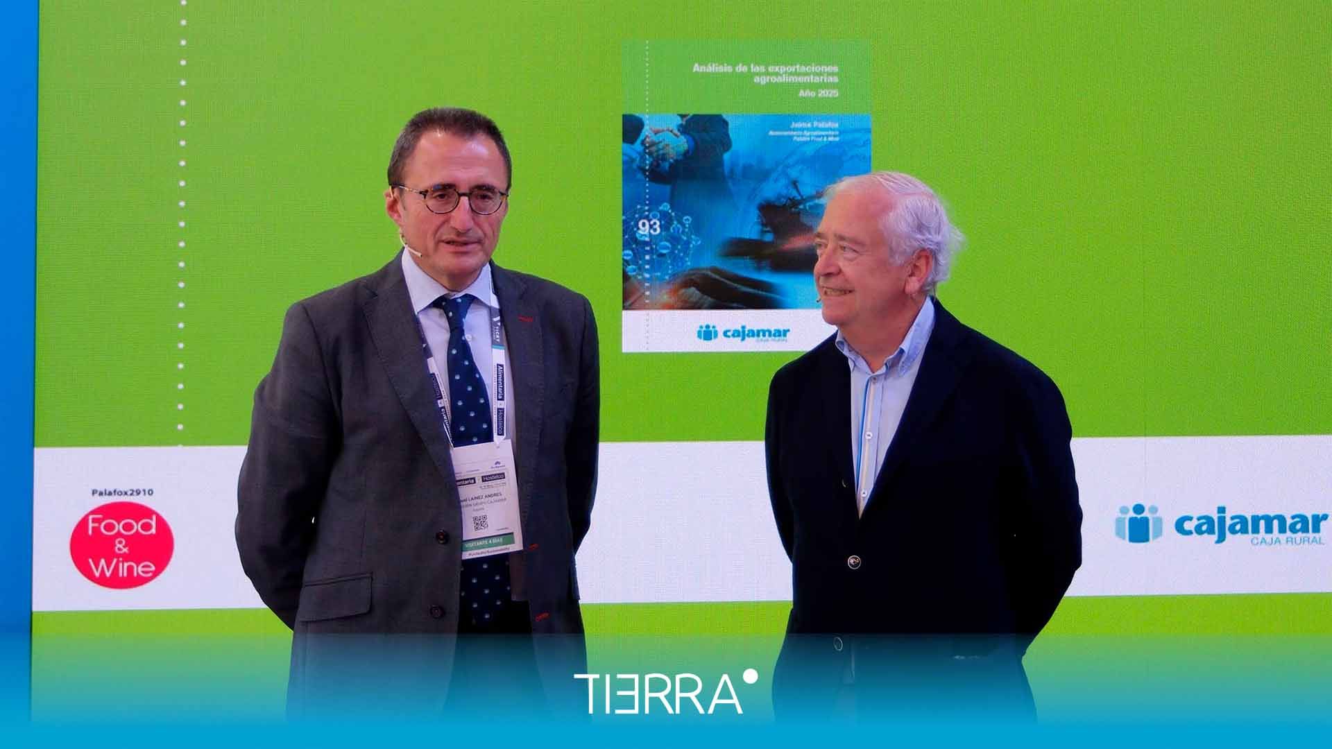 El director de Desarrollo e Innovación Agroalimentaria de Fundación Grupo Cajamar, Manuel Lainez, y el autor del informe Jaime Palafox, han sido los encargados de exponer los principales datos del informe 2025, en el que se especifica que la balanza comercial agroalimentaria cerró el año con un superávit de 17.615 millones de euros, el más elevado entre todos los grandes sectores de la economía española, lo que pone de manifiesto la contribución decisiva del agroalimentario a un sector exterior español estructuralmente deficitario, con una balanza general de bienes negativa en 57.000 millones de euros. En términos relativos, las exportaciones agroalimentarias representan el 20 % del total de bienes exportados por España.