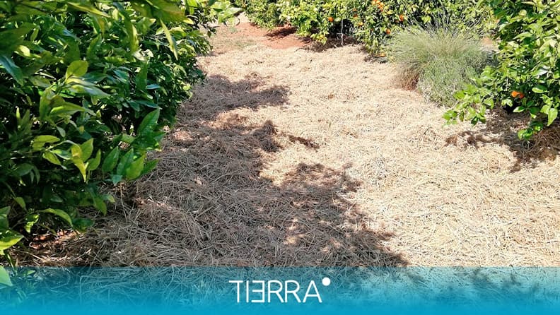 Plantación de cítricos, en la que se combina el uso de acolchado con polipropileno en la hilera y cubierta vegetal en la calle.